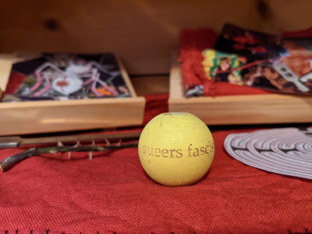 Sphaira, the golden ball that begins the fairytale – the emphatic moment when the ball slots into waiting hands. This began life as part of an interactive art project a friend designed – a gumball machine that dispensed these large, wooden beads, engraved with whimsical and true things. Mine says, in homage to Woody Guthrie, “This machine queers fascists.”